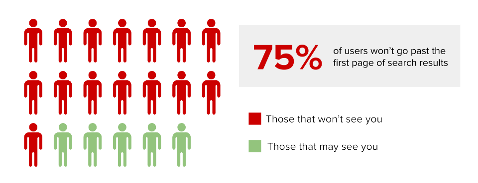 In fact, 75% of users never go past the first page! Studies show that the first result on Google receives over 28% of clicks, with that number dropping sharply for the second result, and sites on the second page getting very little attention.