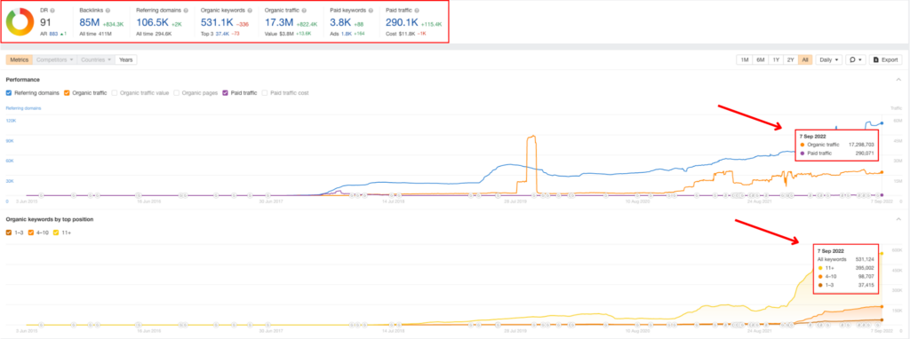 Binance is getting 17 million monthly visits from SEO with 530,000 ranking keywords (of which, 37,000 are in the top 3 results). This has helped them generate over 85 million backlinks and an absurdly impressive DR rating of 91.