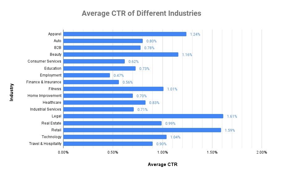 Average CTR for Facebook ads depends on the type of industry you are in. As a rule of thumb, the average click through rate across all industries is 0.90% – but of course, this rate can fluctuate. Below is a graph showing the average CTR of different industries: