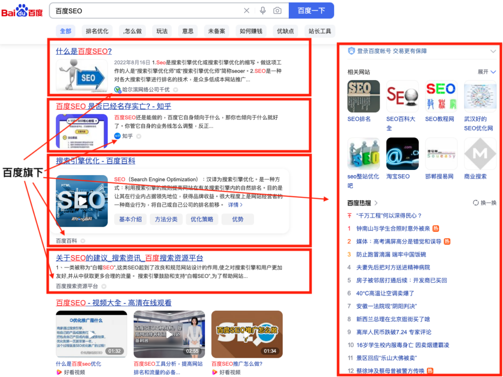 相比谷歌,你會發現百度大部分的搜尋結果都是百度旗下的網站,例如: